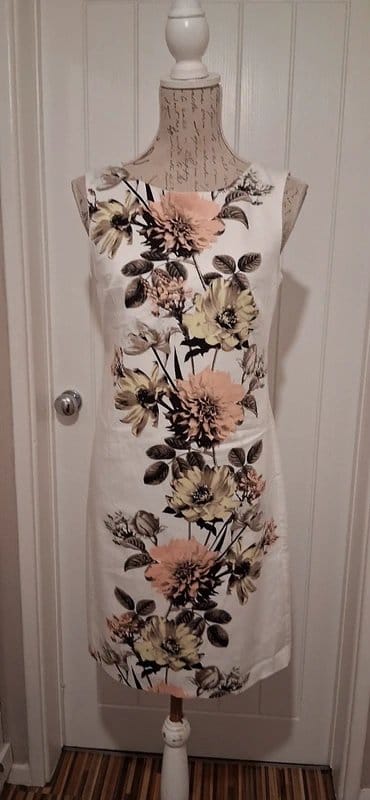 Beautiful white floral dress with a sleeveless design and zip back fastening. Fully lined for comfort, this dress features a slight stretch and measures 17 inches across the bust with a 28-inch length from pit to hemline.