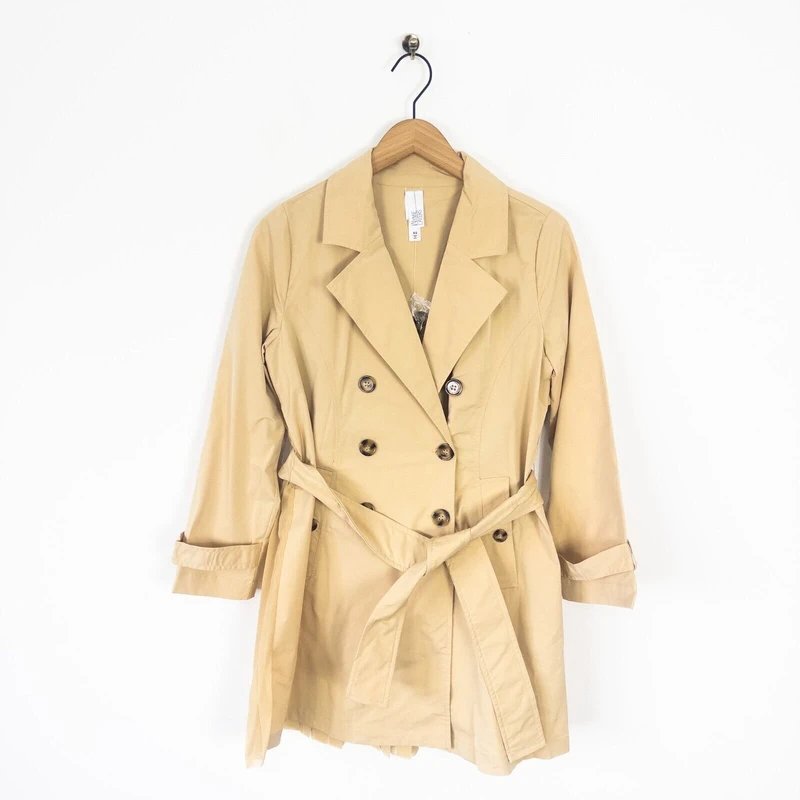 The MarlaWynne Trench Coat with Chiffon Pleated Back in Sand Beige is available in sizes S.