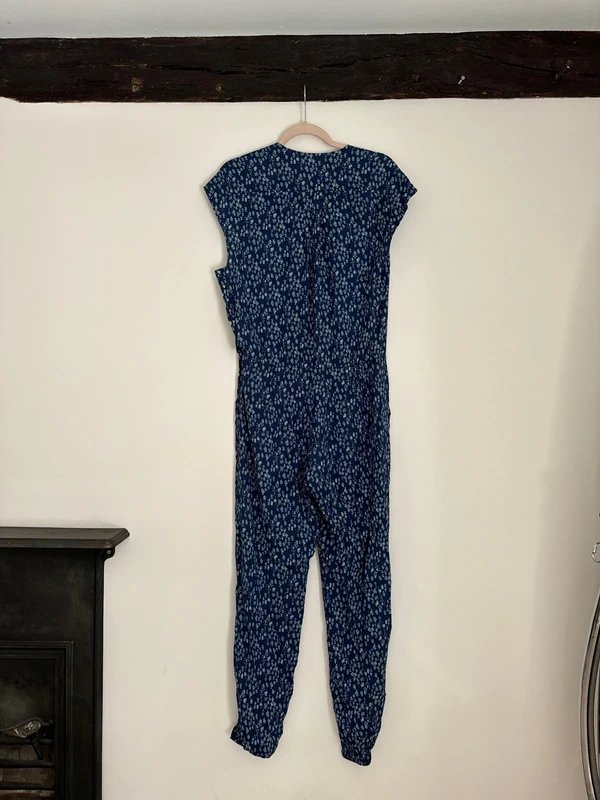 The Mary Mendez Navy Floral Silk Jumpsuit is available in sizes L.