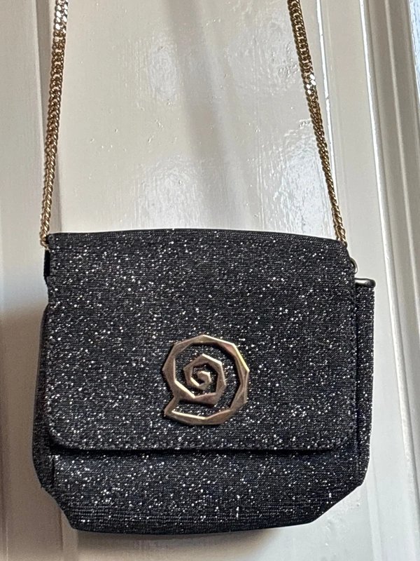 Shine through the night with this stunning Ursula Mascaró small party/cocktail bag. Designed in classic black glitter, it features a unique spiral flower embellishment on the front that adds a touch of luxury and charm. Perfect for cocktail parties, weddings, or any evening occasion.