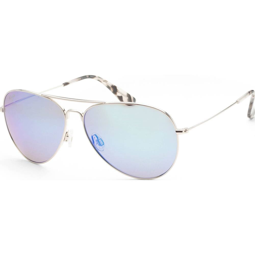 Stylish aviator sunglasses from Maui Jim in a sleek silver finish. Featuring mirrored lenses for glare protection and a durable metal frame with a rubberised grip for comfort. Ideal for outdoor activities and casual wear.