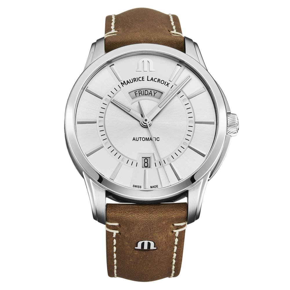 Sophisticated Maurice Lacroix watch with a silver dial and brown leather strap. Features an automatic movement and a date function. Ideal for formal and casual occasions.