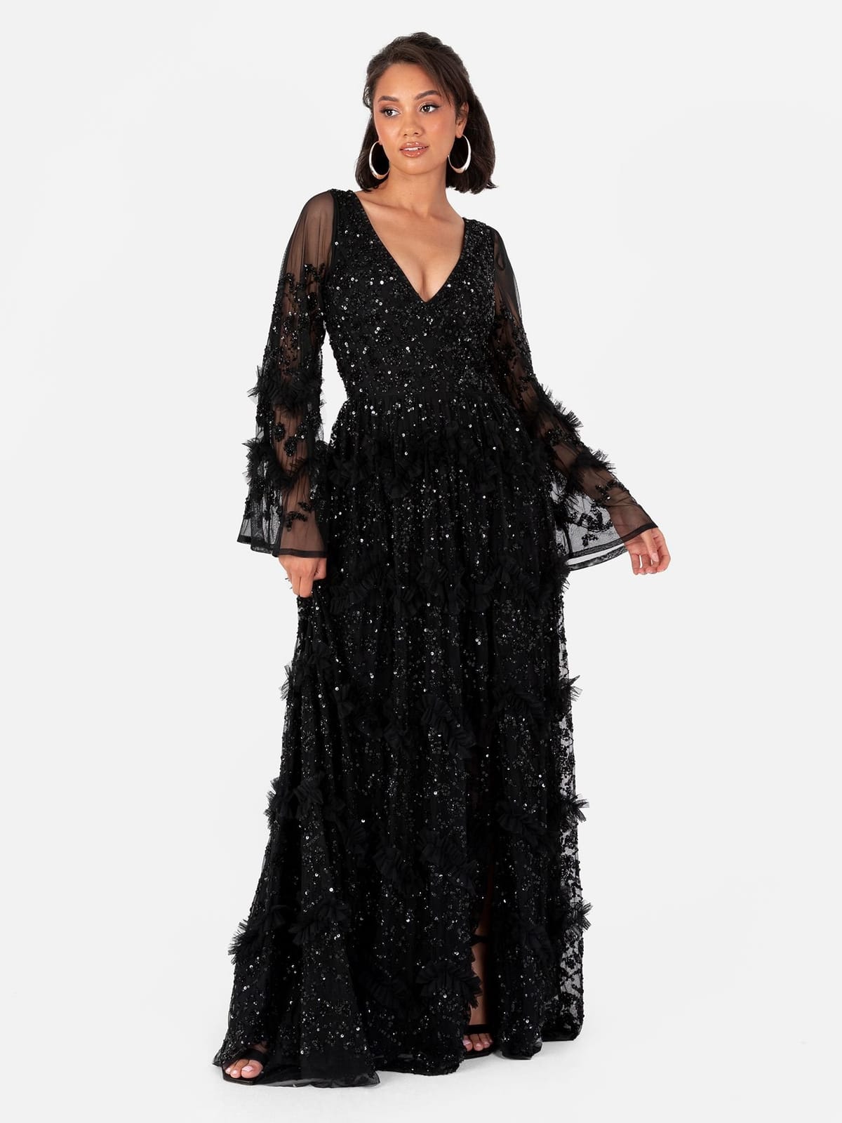 The Maya Deluxe Black Sequin Maxi Dress is made from sequin, lace.