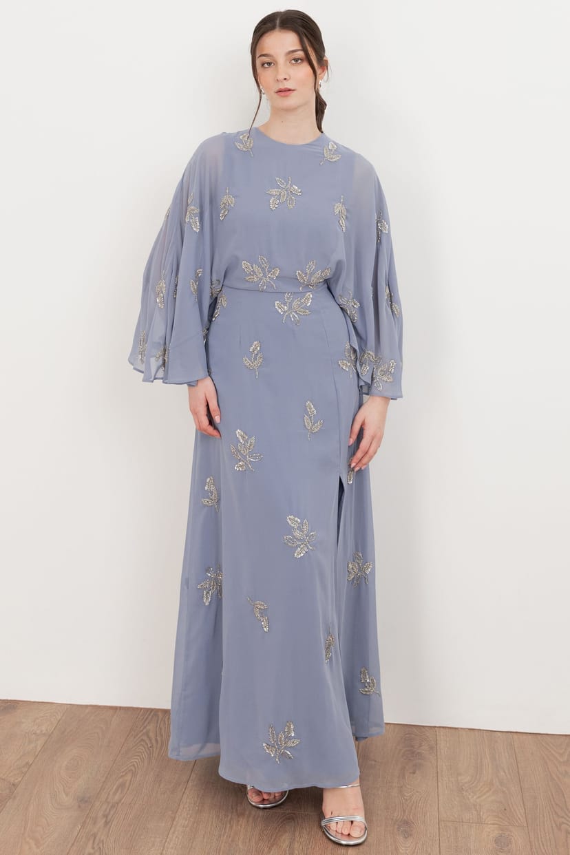 Sophisticated maxi dress in Wisteria Blue georgette featuring hand-sewn floral appliques. The round neckline and cape sleeves add a dramatic flair, while the A-line skirt with a side split ensures a graceful flow. Ideal for elegant evening events.