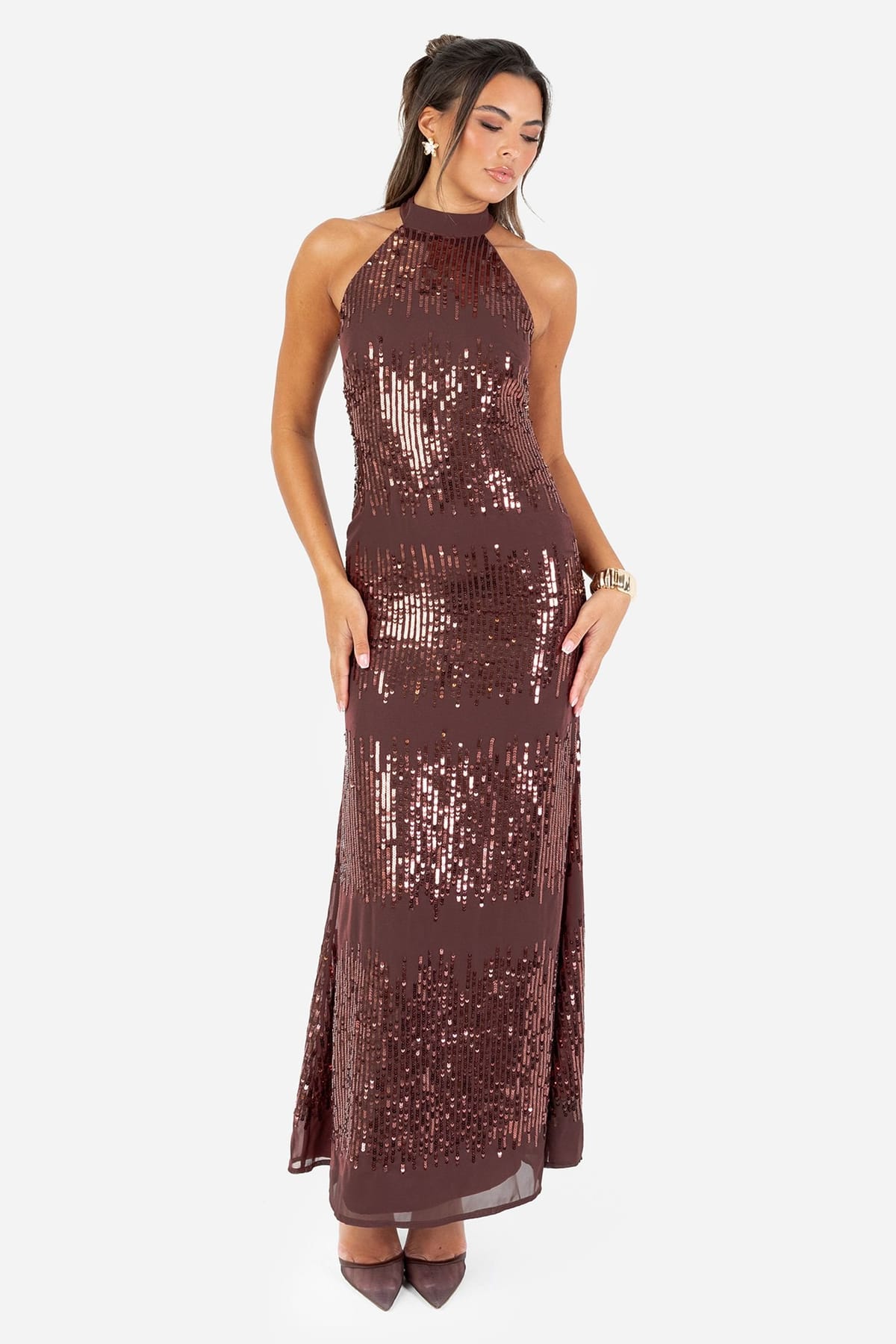 This brown sequin halter maxi dress features a fitted bodice and an A-line silhouette. The linear sequin embellishments add a touch of sparkle, perfect for special events.