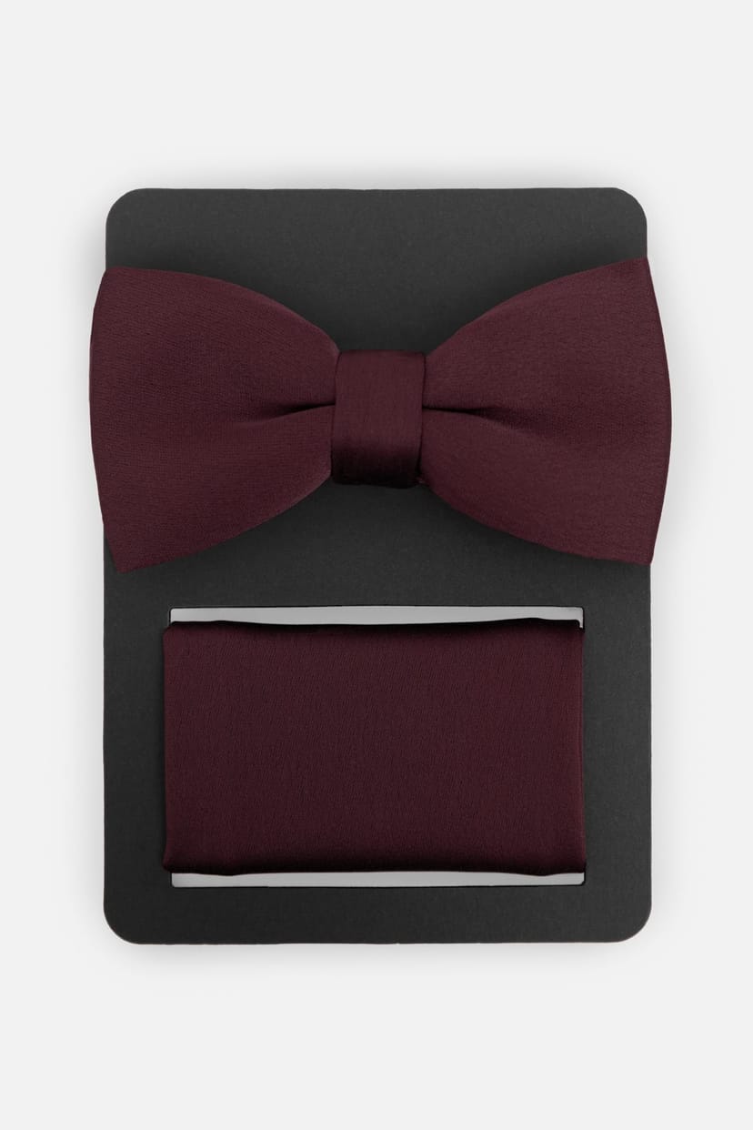 Elegant burgundy satin bow tie and pocket square set. Pre-tied bow tie and matching pocket square for a coordinated look. Perfect for formal events and weddings.