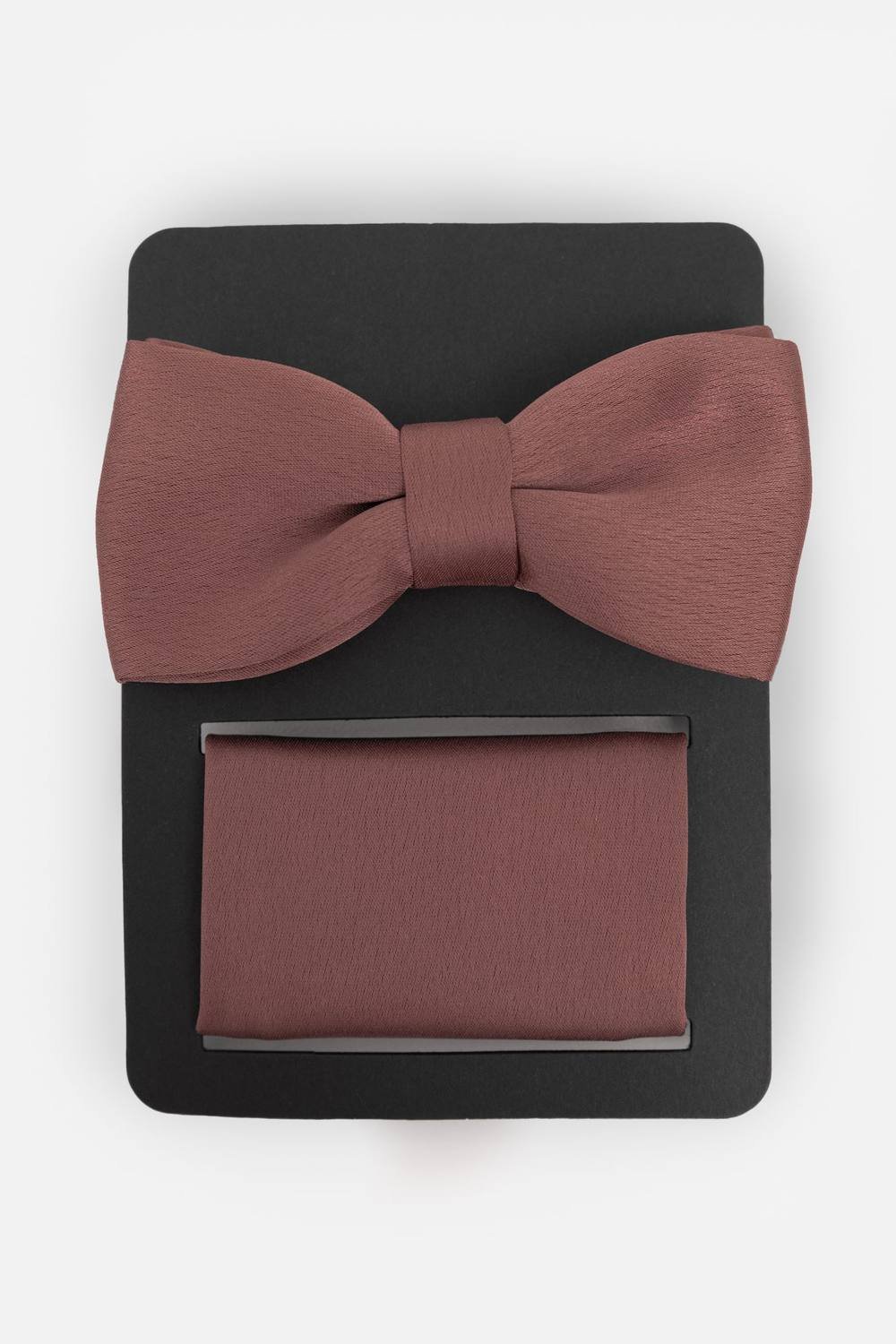 Elegant dark mauve satin bow tie and pocket square set. The pre-tied bow tie and matching pocket square add a touch of refined elegance to any tailored suit.