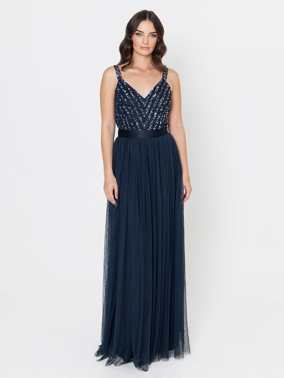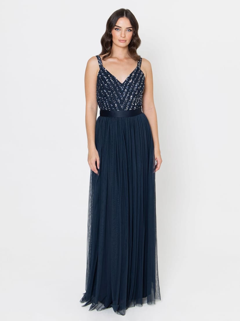 The Maya Deluxe Dark Navy Embellished Maxi Dress is made from satin, tulle.