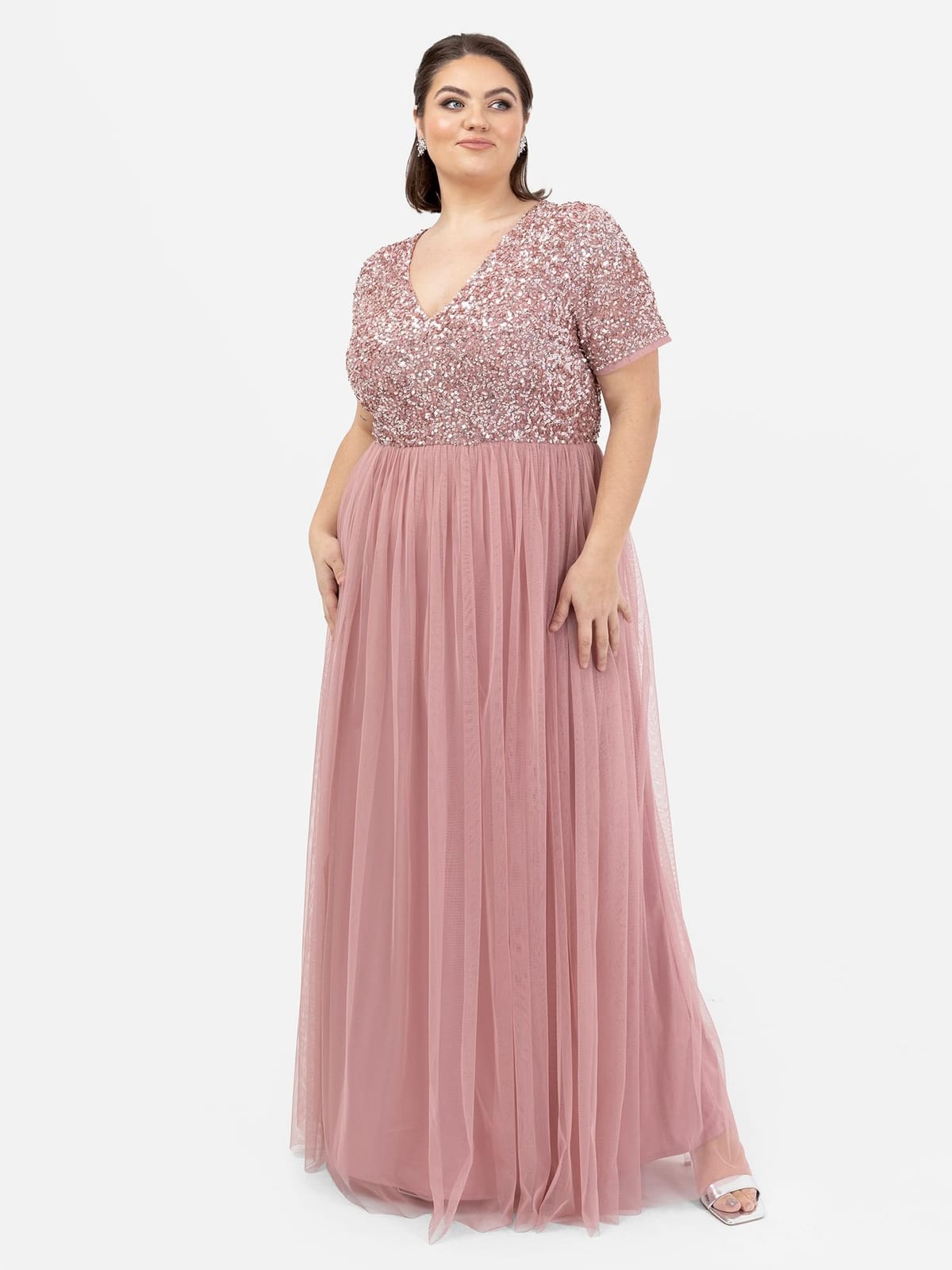 The Maya Deluxe Dusty Pink Sequin V-Neck Maxi Dress is available in sizes 10, 12, 14, 16, 18.