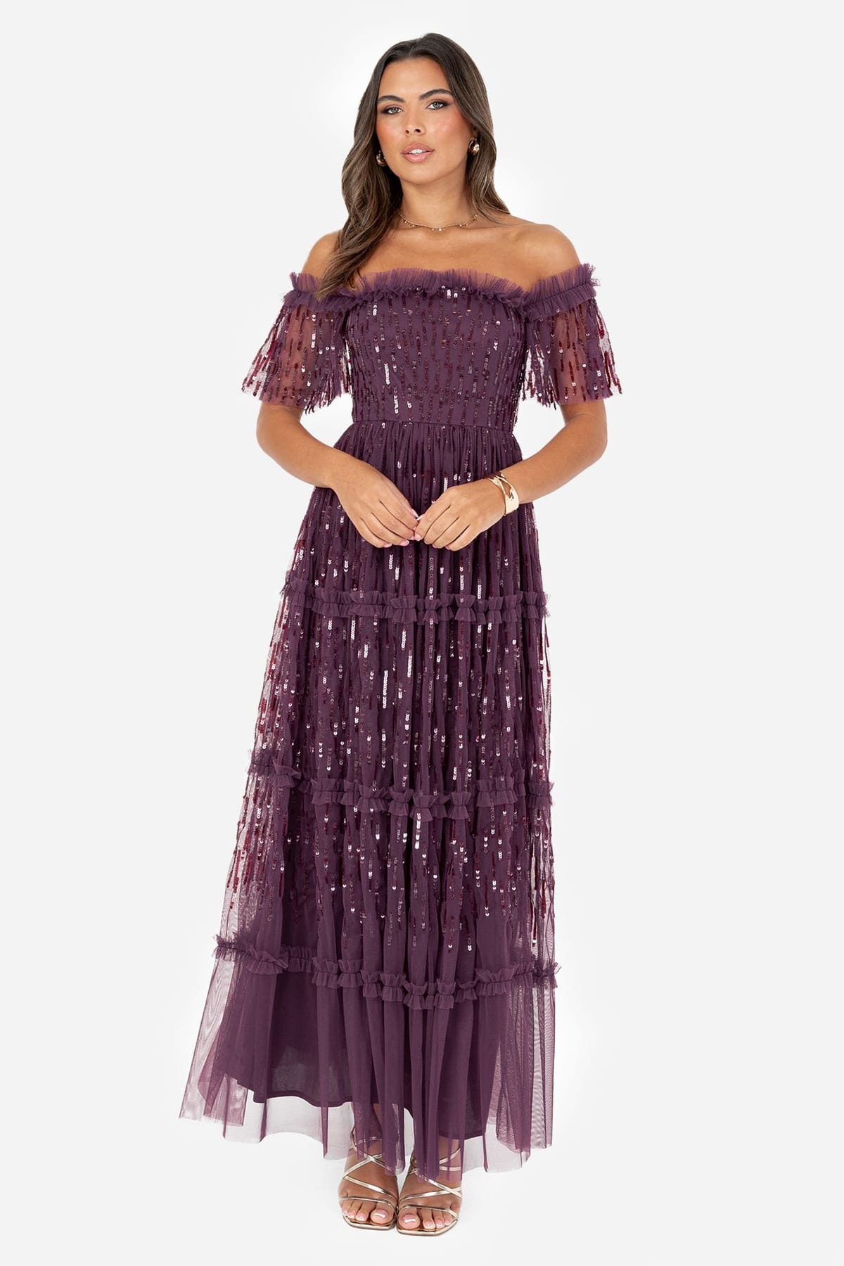 The Maya Deluxe Grape Sequin Bardot Maxi Dress is available in sizes 16.