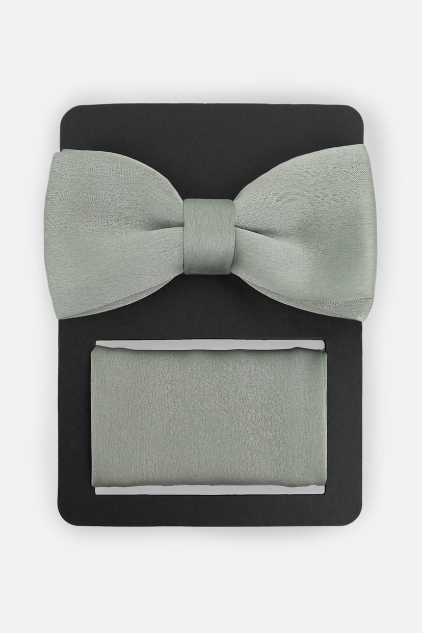 Stylish green satin bow tie and pocket square set by Maya Deluxe. The pre-tied bow tie and matching pocket square add a touch of elegance to any formal outfit.