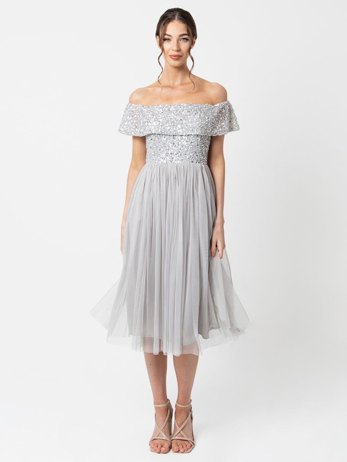 Sophisticated grey embellished bardot midi dress with an off-the-shoulder neckline and short sleeves. The double-layer bodice adds an elegant touch, while the gathered tulle skirt ensures graceful movement.