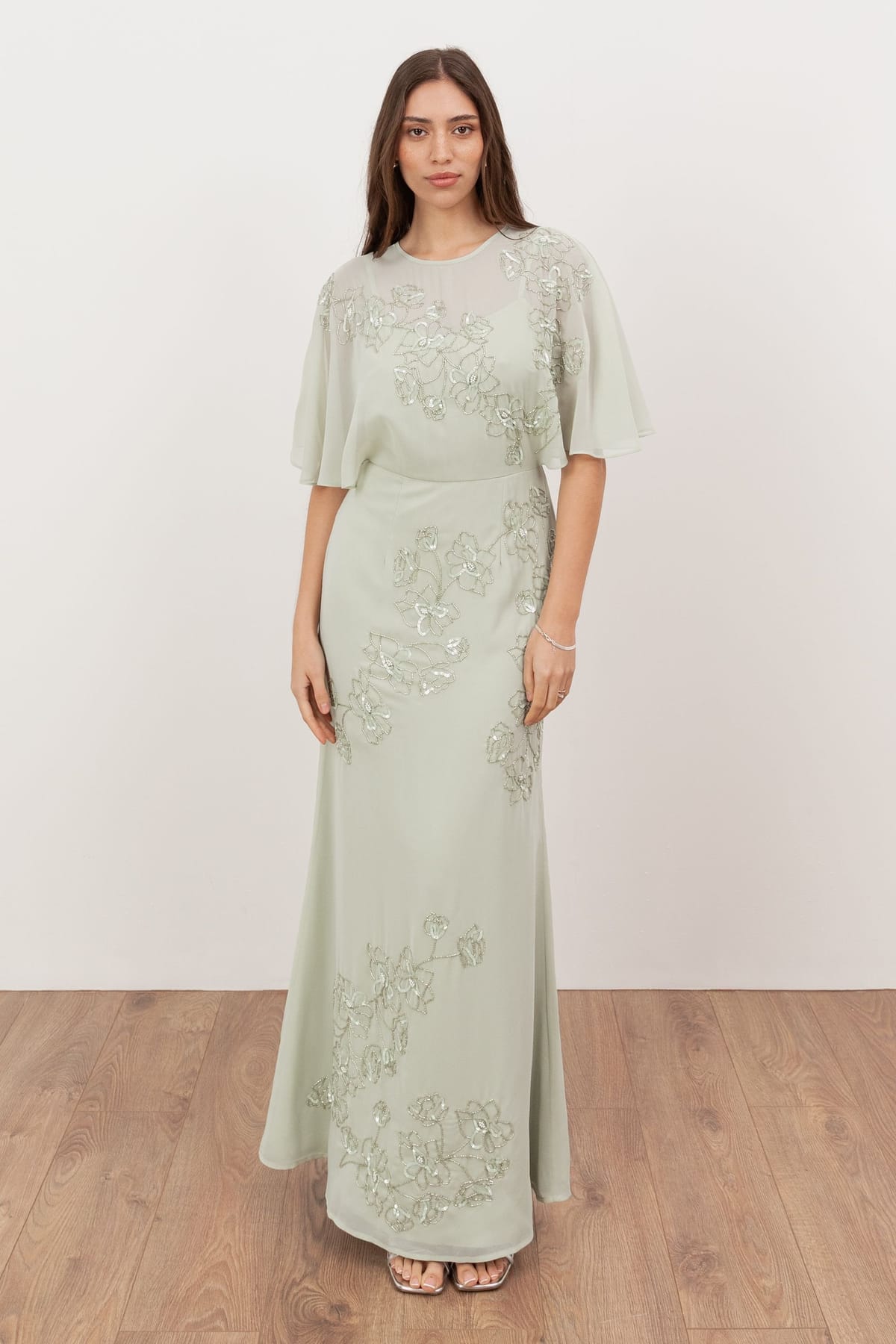 The Maya Deluxe Light Green Floral Embellished Maxi Dress is made from chiffon, sequins, beads.