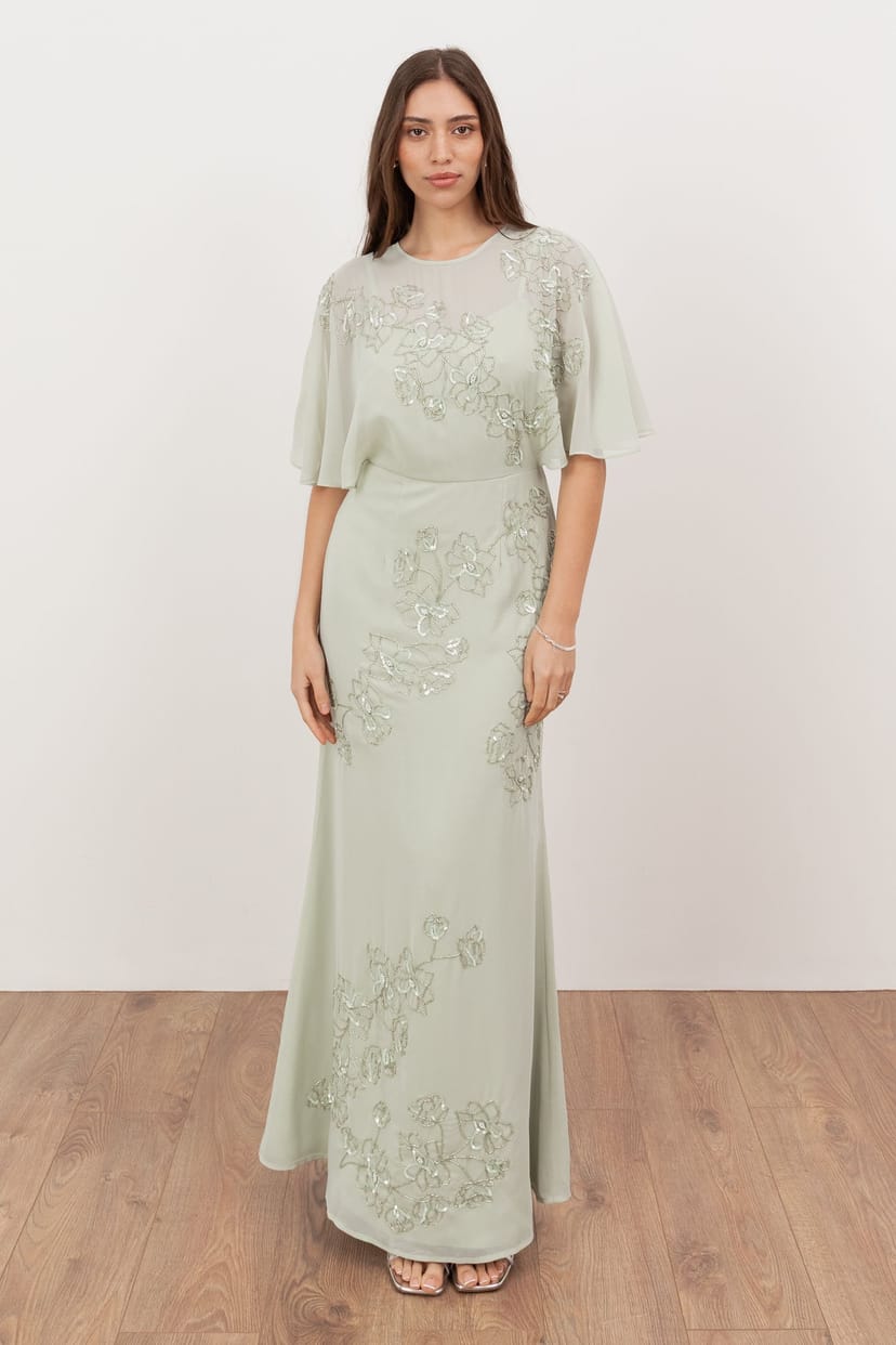 The Maya Deluxe Light Green Floral Embellished Maxi Dress is available in sizes 12, 20.