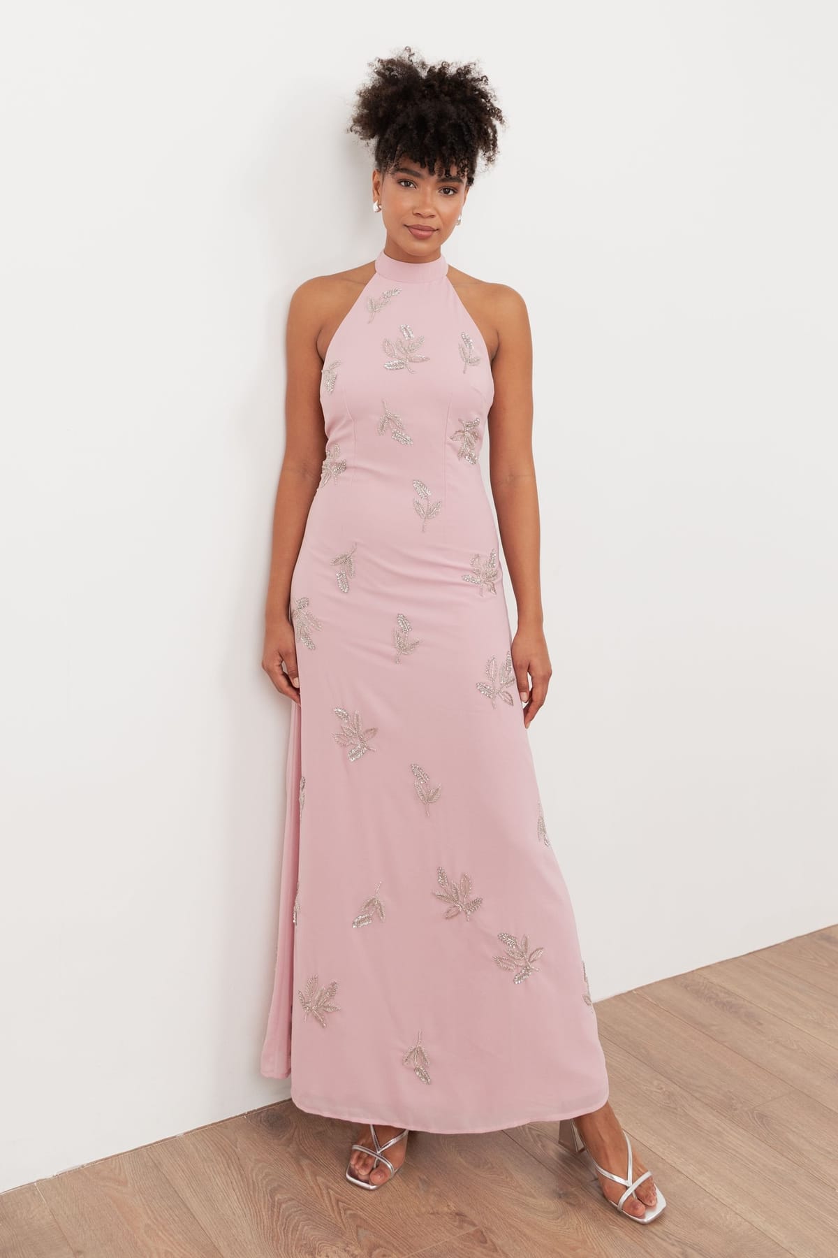 The Maya Deluxe Light Pink Embellished Halter Maxi Dress is available in sizes 10, 12, 14, 16, 18, 6, 8.