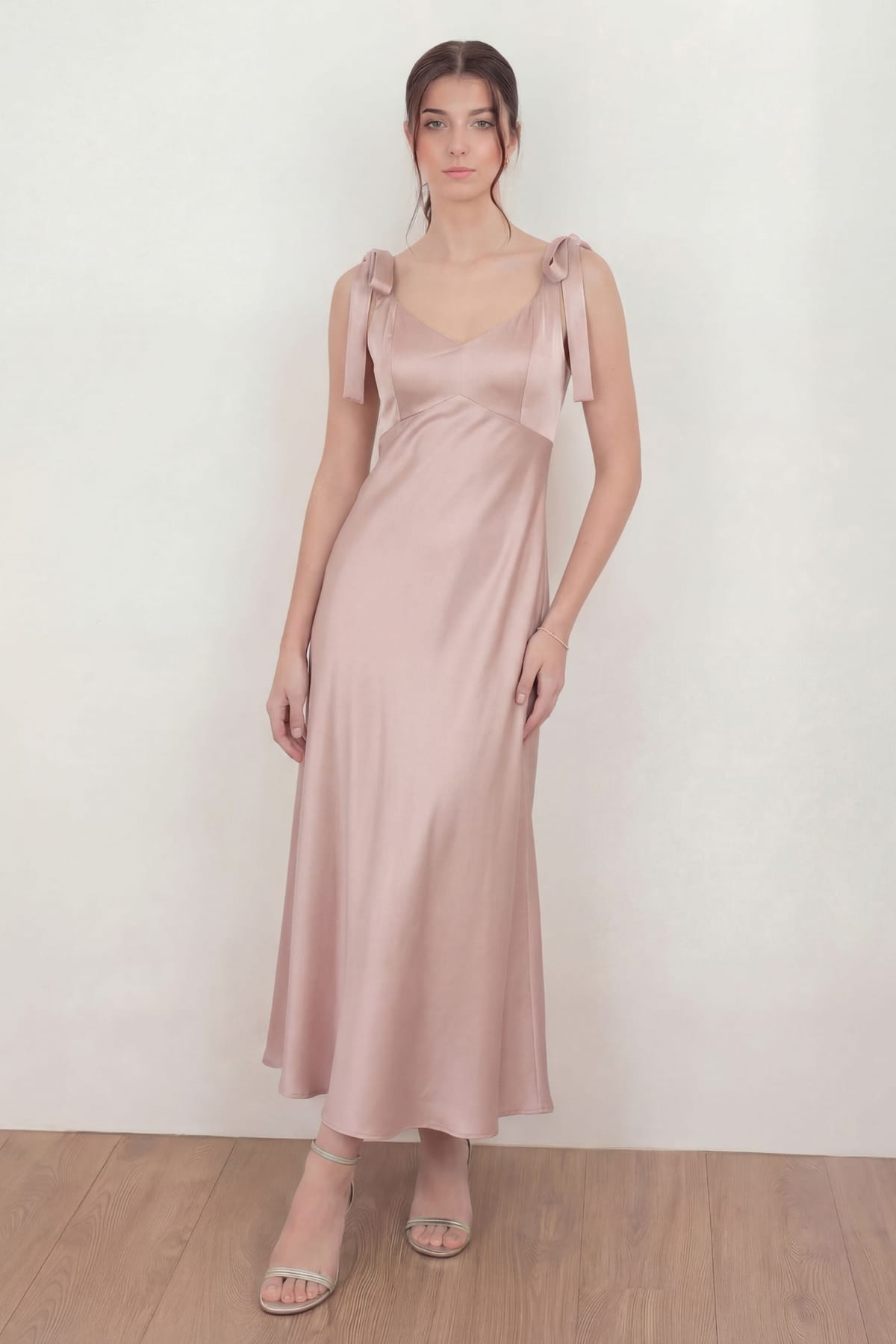The Maya Deluxe Light Pink Satin Tie-Shoulder Maxi Dress is ideal for evening, wedding, party.