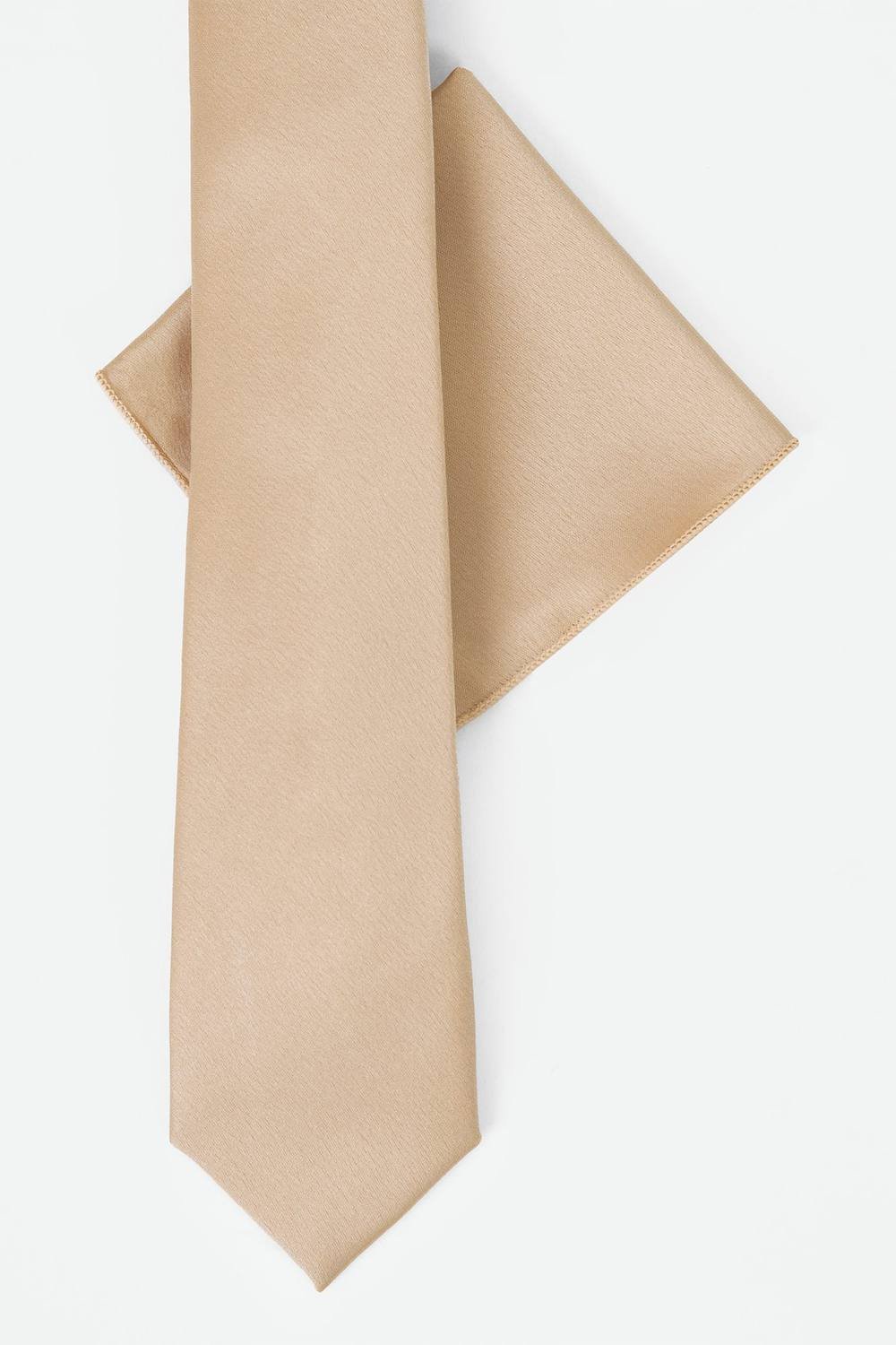 Sleek nude satin tie and matching pocket square set, crafted for a polished look. Ideal for weddings and formal events.