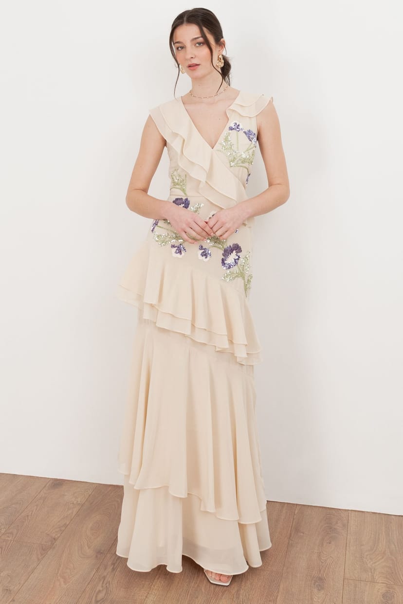 This nude maxi dress by Maya Deluxe features hand-embellished floral motifs with sequins and beads for a subtle shimmer. The V-neck bodice with asymmetrical ruffle detailing flows into the skirt, creating a contemporary, feminine finish.
