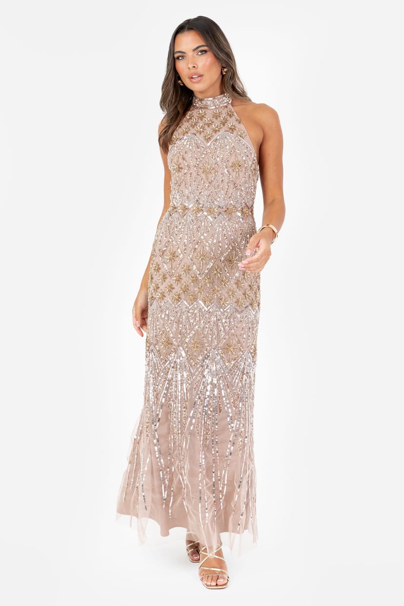 The Maya Deluxe Nude Embellished Halter Maxi Dress is available in sizes 16.