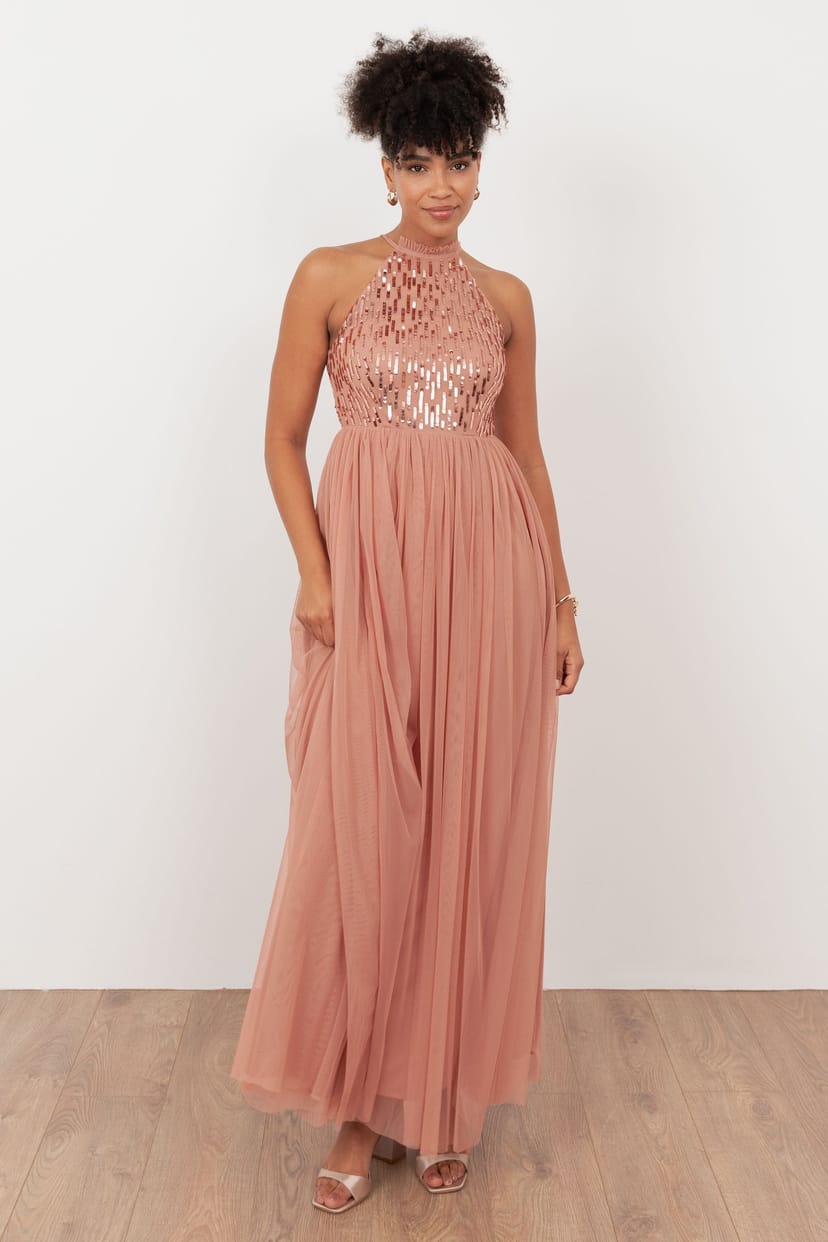 The Maya Deluxe Pink Sequin Halter Maxi Dress is available in sizes 10, 12, 14, 16, 18, 6, 8.