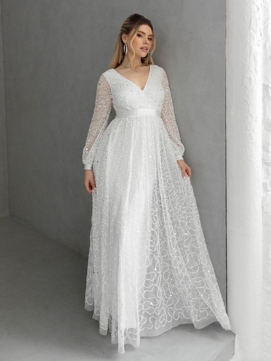 This white embellished maxi dress by Maya Deluxe features a V-neckline and long sleeves. The A-line silhouette and gathered waist create a swishy ruffling effect. Ideal for evening events or as a bold bridal choice.