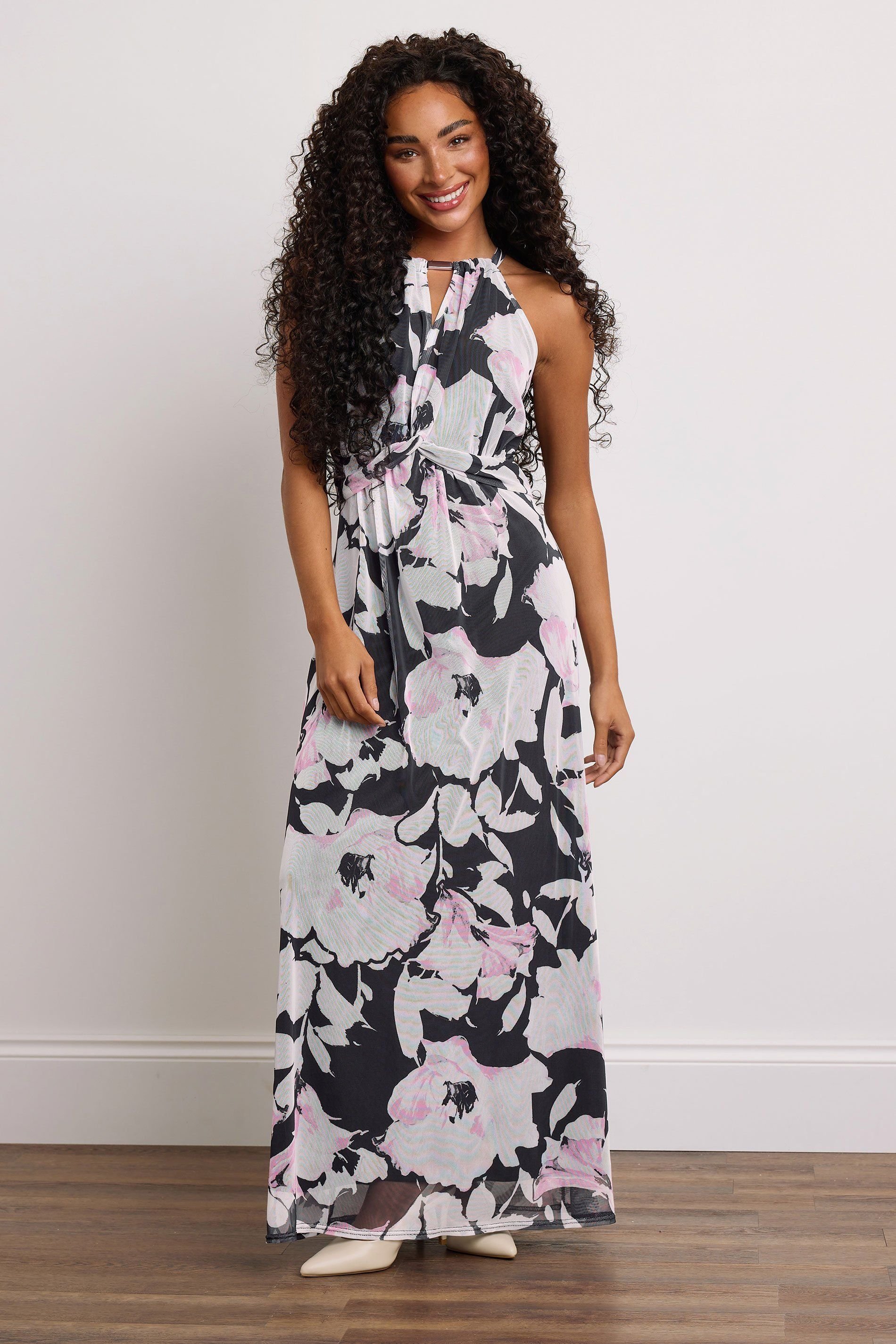 Effortless elegance in this M&Co maxi dress with a halter neckline and floral print. Made from breathable mesh fabric, it features a knot front detail and sits at a maxi length. Perfect for summer evenings.