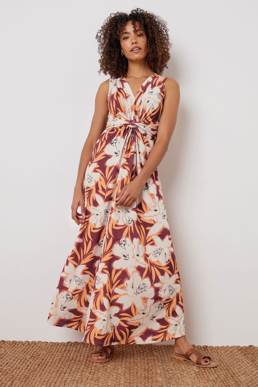 The M&Co Orange Tropical Print Knot Front Maxi Dress is available in sizes 10, 12, 14, 16, 18, 20.