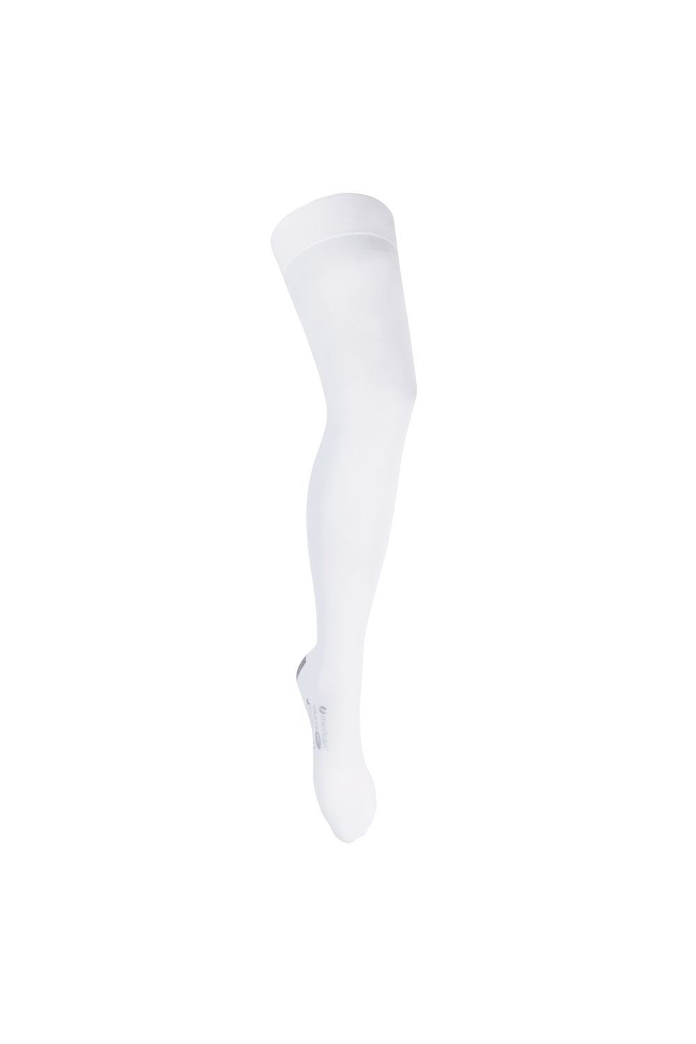 These Medalin Men's Anti-Embolism Thigh High Stockings in white are designed to reduce the risk of blood clots. Made from a blend of Elastane and Nylon, they provide graduated compression to improve circulation.