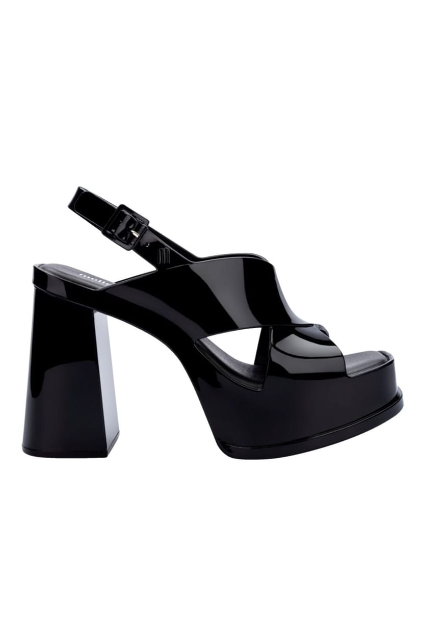 Step into a bold statement with Melissa Shoes' Black Dance Jelly Heels. These high-heeled sandals feature a patent leather-like material with a chunky platform sole and a block heel. The open toe design and cross-strap fastening add a modern edge to the classic high heel silhouette.