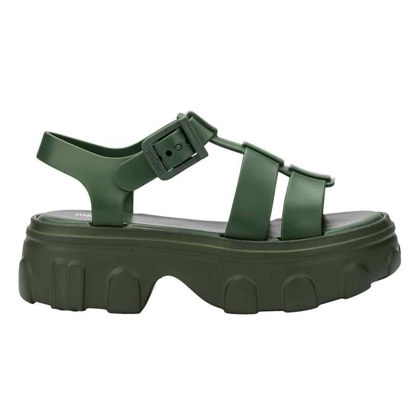 View Debenhams's returns policyStylish Melissa Shoes Ella Sandals in green. Featuring a chunky treaded sole for grip and a fisherman-style upper for a bold look. Perfect for blending runway sophistication with street-style edge.