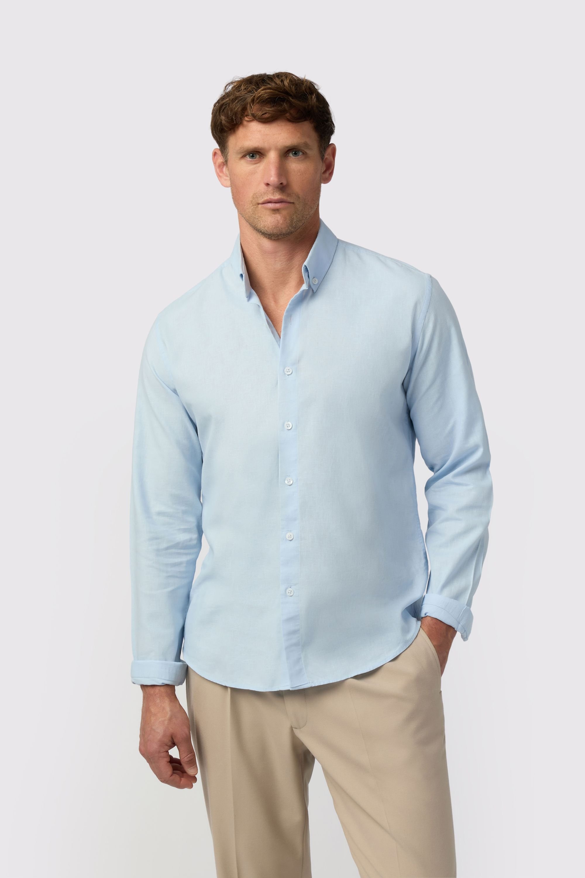Stylish Melka long sleeve shirt in light blue linen perfect for a relaxed holiday look. Designed to be worn untucked and open-necked.