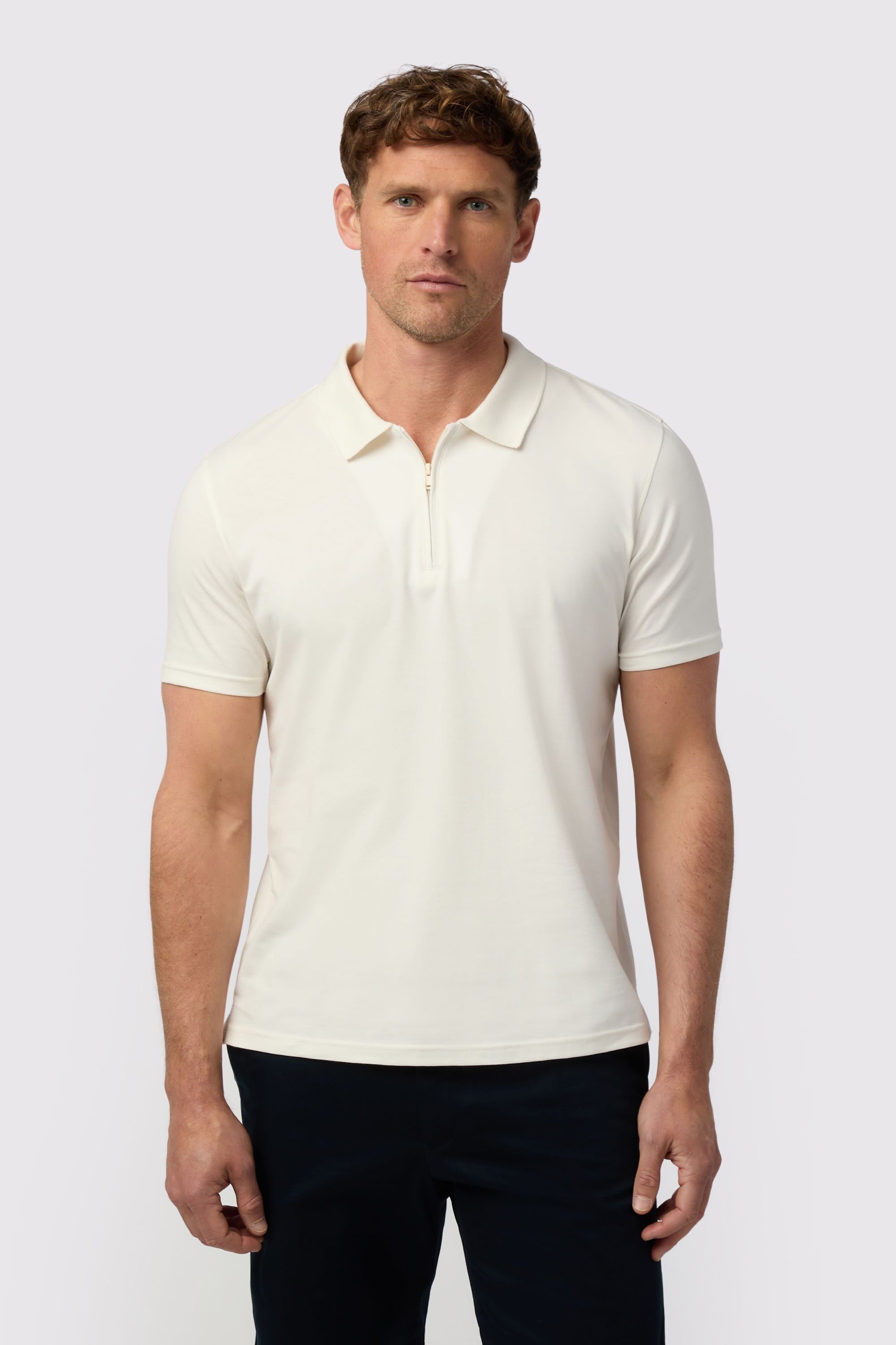Stylish Melka polo shirt in ecru featuring a quarter zip for easy wear. Made from 100% Egyptian cotton, it offers softness and flexibility. Ideal for casual office wear.