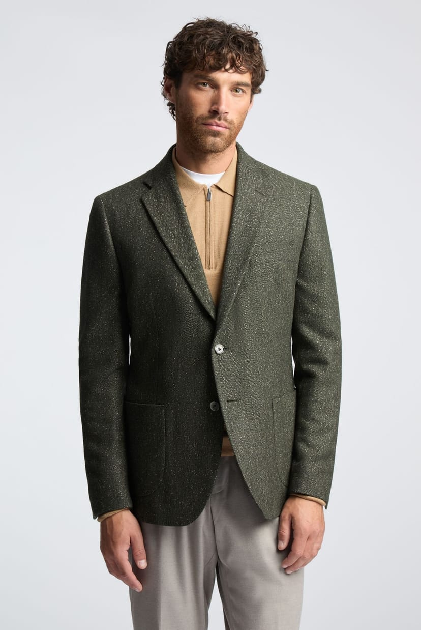 Stylish Melka blazer in herringbone green fabric with patch pockets. Ideal for a smart casual look, pair with trousers and a t-shirt.