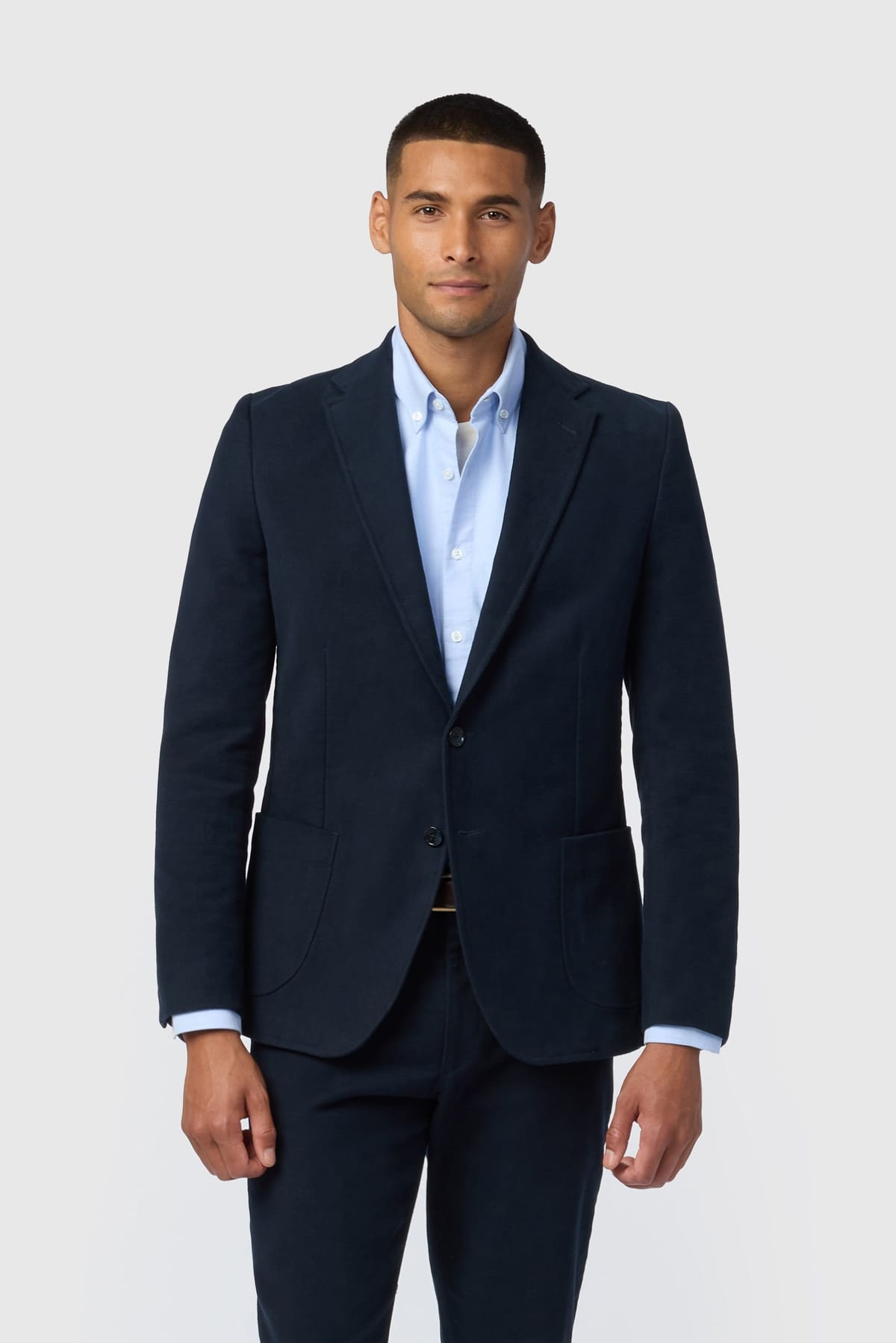 See all outfit ideasStylish navy moleskin blazer with a sleek and modern fit. Features patch pockets and a single-breasted button closure. Ideal for a smart-casual look.