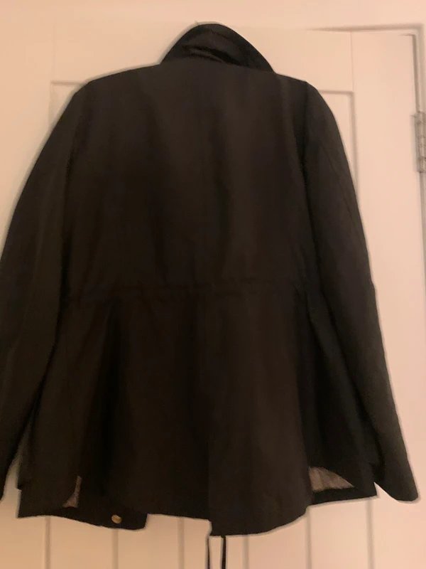 Stylish black jacket with front, side, and zipped breast pockets. Features a drawstring at the waist for a cinched look. Perfect for casual and formal occasions. Crafted from durable fabric for long-lasting wear.