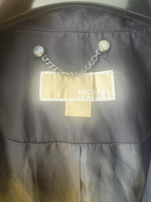 Elegant navy Michael Kors coat featuring a tailored silhouette and waterproof material, perfect for rainy days. The zipper closure and long sleeves offer both style and functionality.