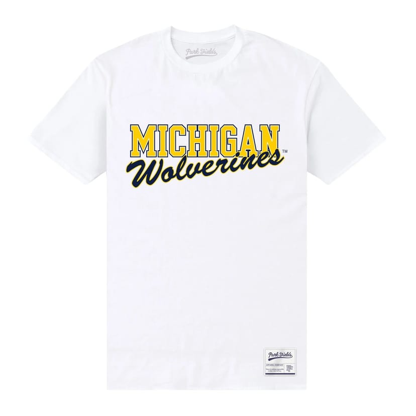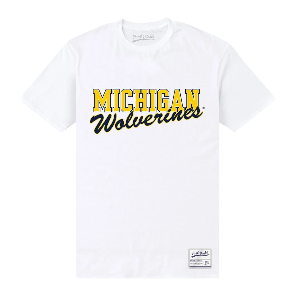 The Michigan Wolverines Men's Text T-Shirt in White is available in sizes 2XL, L, M, S, XL.