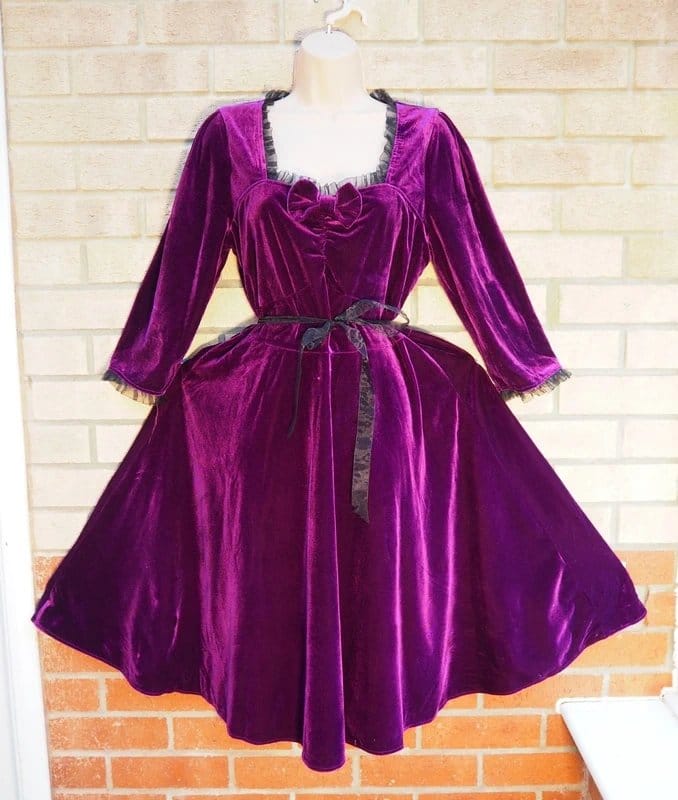 This purple velvet midi dress by Mika features a bow neckline, long sleeves, and a full skirt. The dress is perfect for winter parties with its gothic style.
