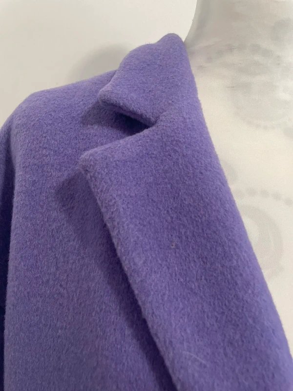Gorgeous lilac colour with black lining. Classic styling with deep revere collar, and dropped shoulders. Single button closure. Crafted from velvet, this oversized coat features a revere collar and drop shoulders. Perfect for layering over dresses or casual outfits. Ideal for cool weather occasions.
