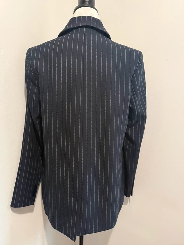 The Mint Velvet Navy Pinstripe Blazer in Double Breasted Style is available in sizes M.