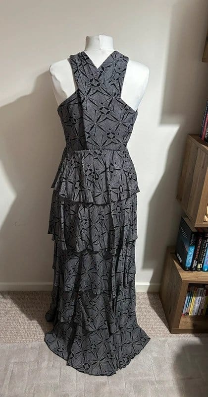 This stunning maxi dress from Mint Velvet's special occasionwear range features a crossover halter top and a long tiered ruffle skirt. The black geometric print adds a touch of elegance. Ideal for special events.