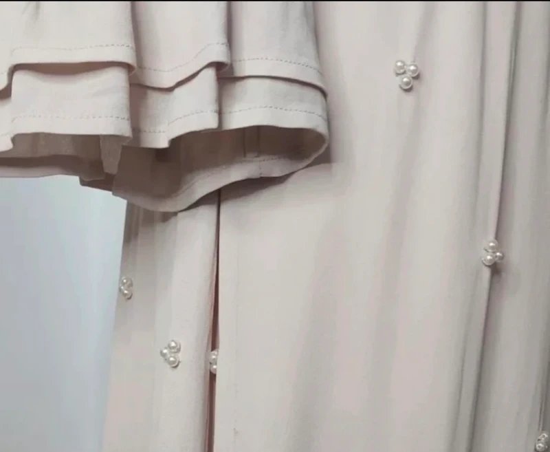 This Beige party dress features ruffle details and pearl accents, perfect for evening events. The elegant design is complemented by a flattering fit.