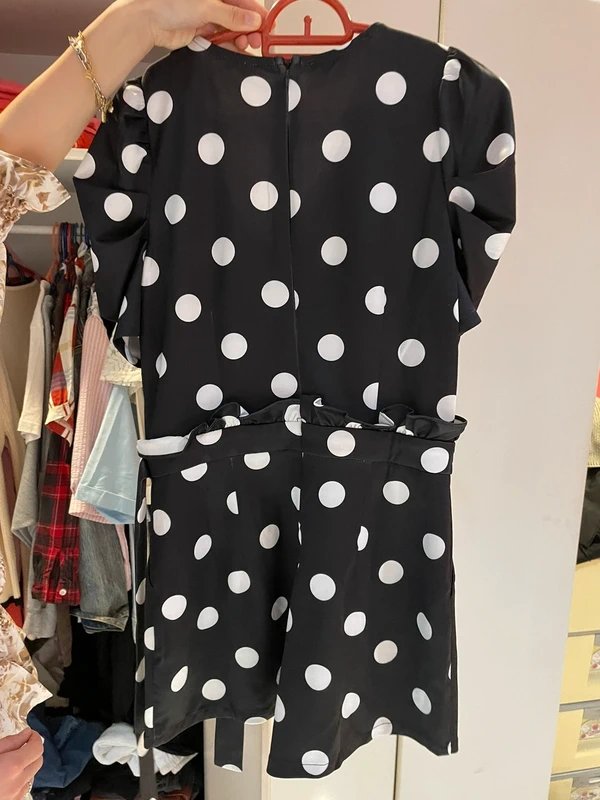 Black Polka Dot Jumpsuit — the must-have occasion dress for casual outings, parties, and special events. Designed in vibrant black with white polka dots, this short-sleeve jumpsuit features a round neckline, a high waist, and a relaxed fit. Crafted from lightweight satin with a polka dot pattern, it catches the light beautifully. Includes a full-length jersey slip for comfort and coverage.