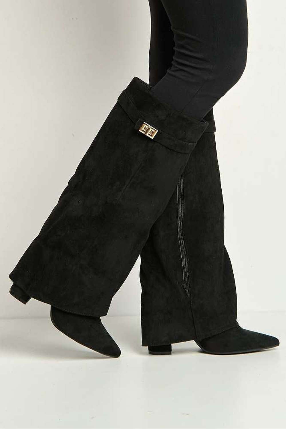 Stylish black faux suede calfboots with a pointy toe and block heel. Featuring a collared neckline and a clasp detail, these boots are perfect for adding a touch of luxury to any outfit.
