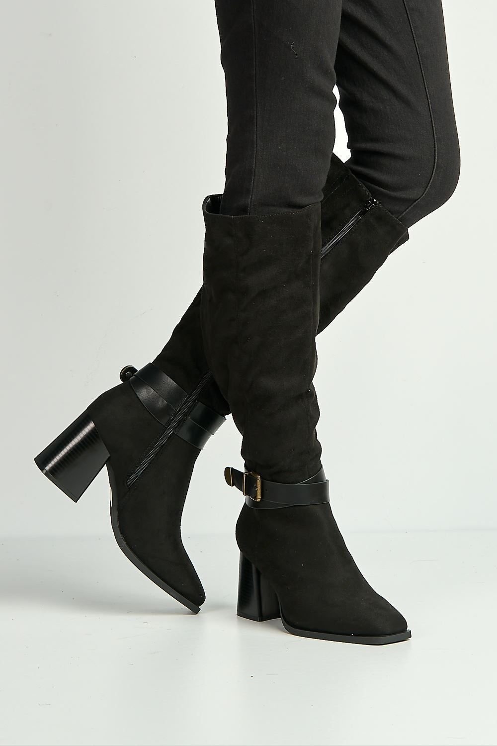 Sleek knee-high boots in black suede with bold gold buckle detailing. The block heel adds height and comfort to your look. Ideal for evening events or casual outings.