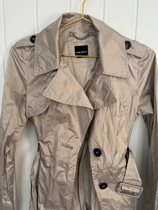 The Miss Sixty Shiny Satin Trench Coat in Beige is available in sizes S.