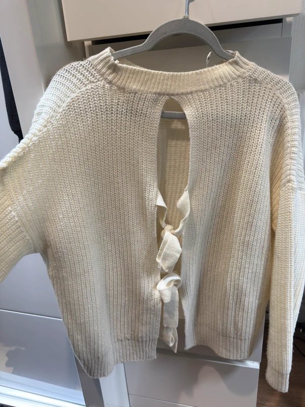 Cream Knit Jumper with ties on the back. Perfect for casual wear, this jumper features a relaxed fit and a cozy knit fabric. Ideal for layering over your favorite tops or wearing on its own for a simple yet stylish look.