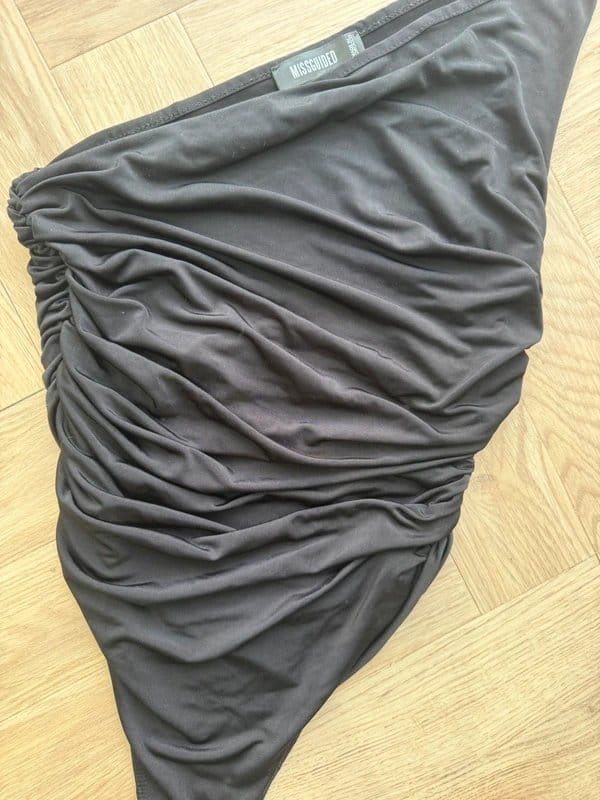 This stunning Missguided black one-shoulder ruched bodysuit/dress top features a sculpting fit with an elegant asymmetric design. Perfect for nights out, events, holidays, or layering, it hugs the body beautifully with ruched detailing to enhance shape.