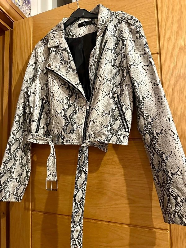 The Missguided Faux Snake Skin Cropped Jacket in Beige/Grey is available in sizes M.