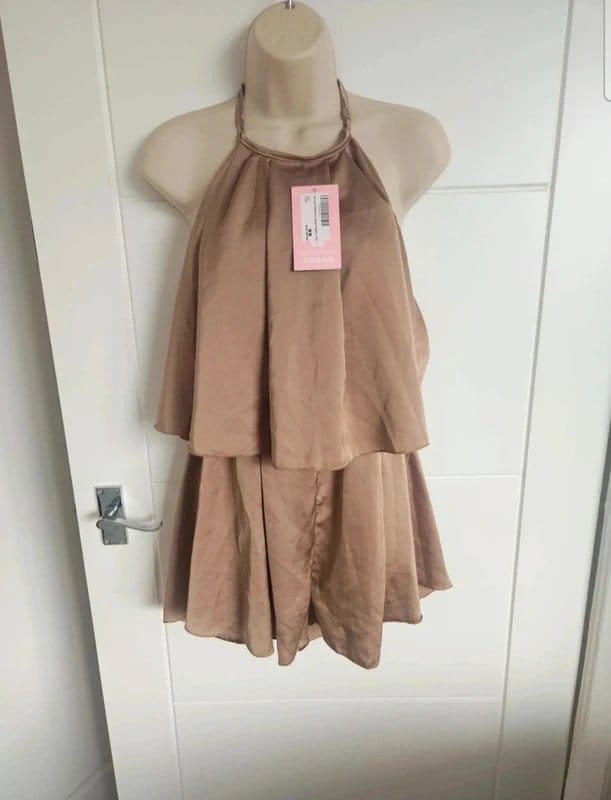 See all outfit ideasThis Missy Empire playsuit features a taupe satin fabric with a layered halter design. The tie-back straps and elegant silhouette make it perfect for evening events or special occasions.